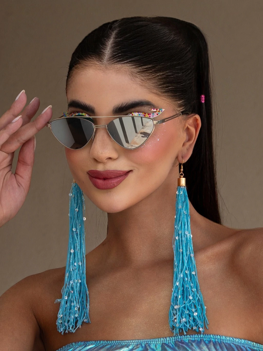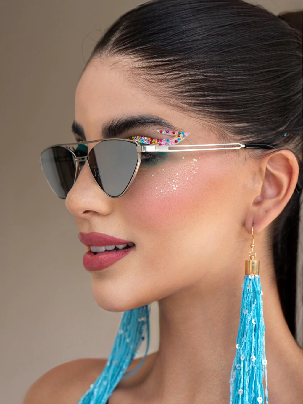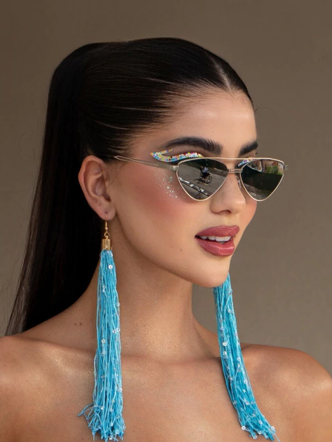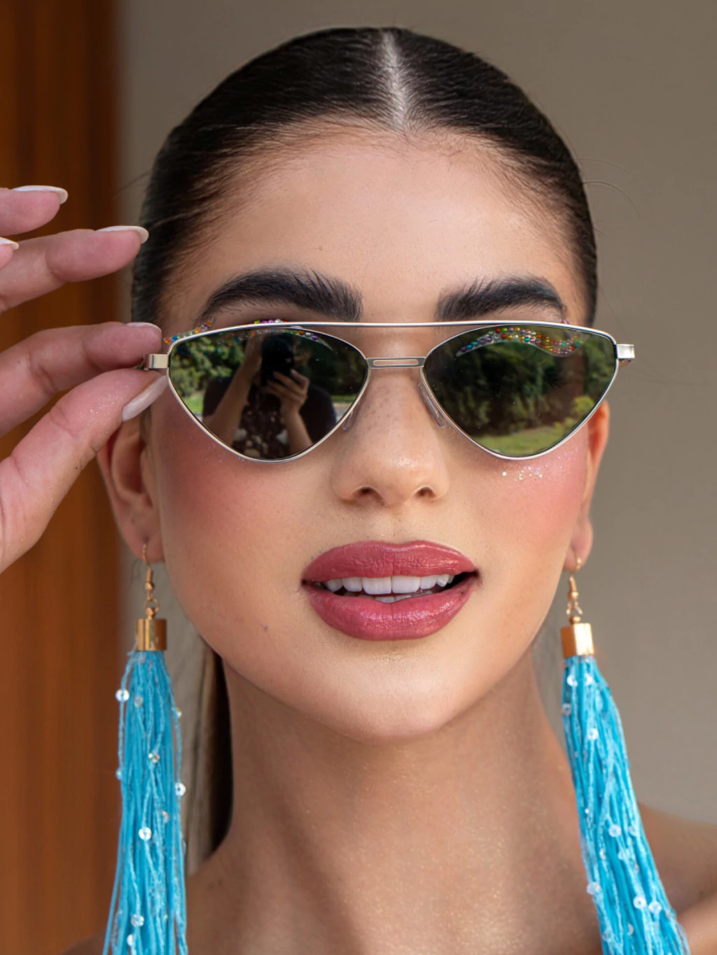 Com lentes prata espelhadas e hastes também em prata, cria um look luxuoso e moderno que se destaca em qualquer ocasião. O efeito espelhado das lentes adiciona um toque especial e futurista ao visual, enquanto o prata total traz aquela elegância sofisticada. O formato gatinho é um verdadeiro charme, trazendo aquele toque vintage glamouroso que nunca sai de moda. O tamanho generoso das lentes (4 cm de diâmetro) oferece proteção completa e um visual marcante que chama atenção por onde passar.