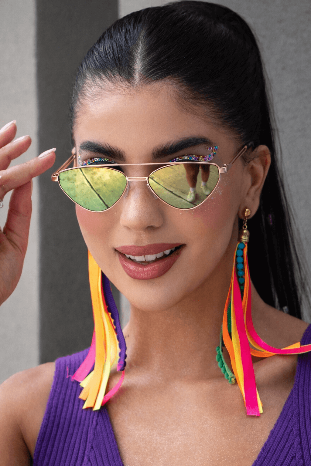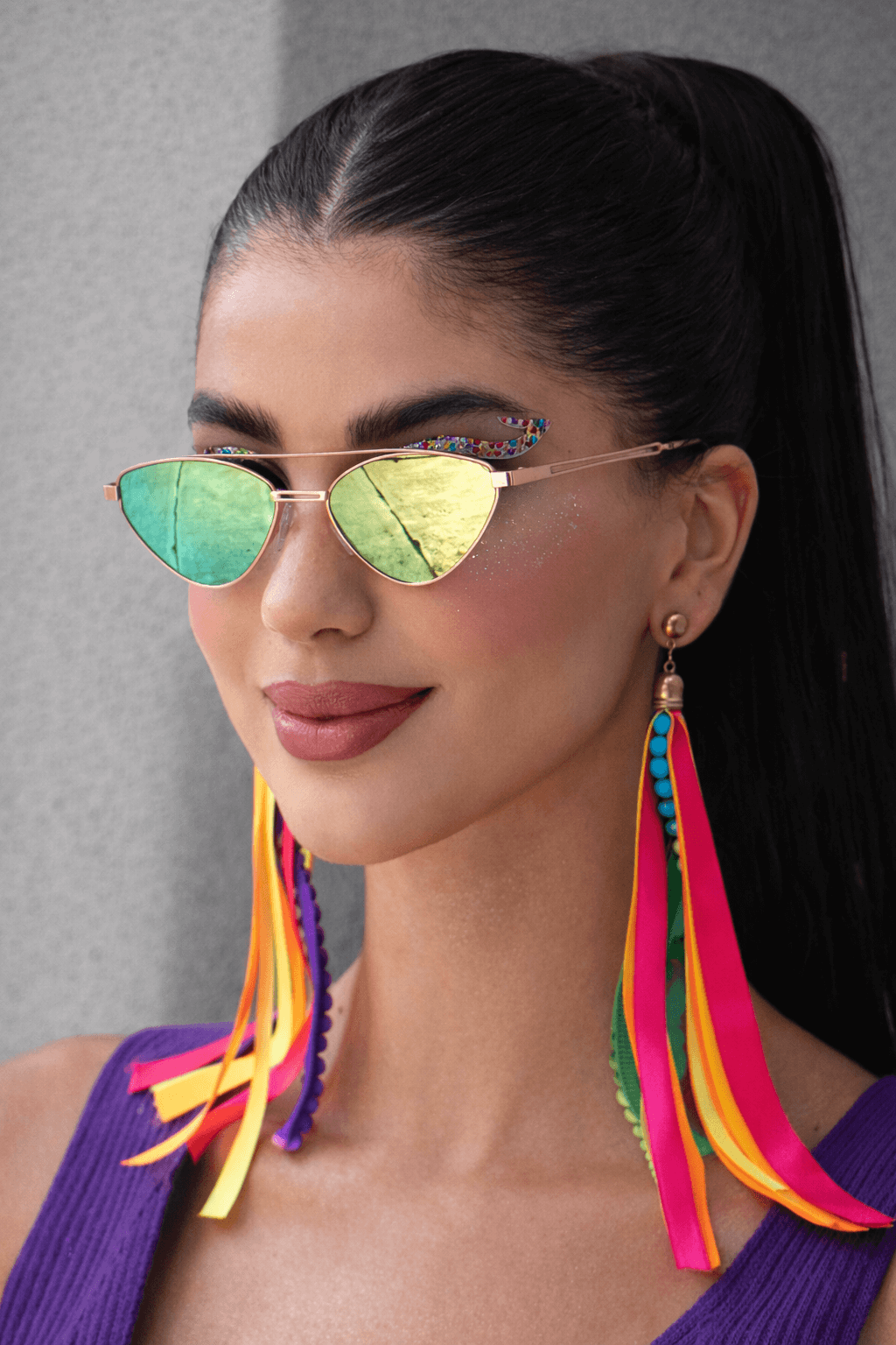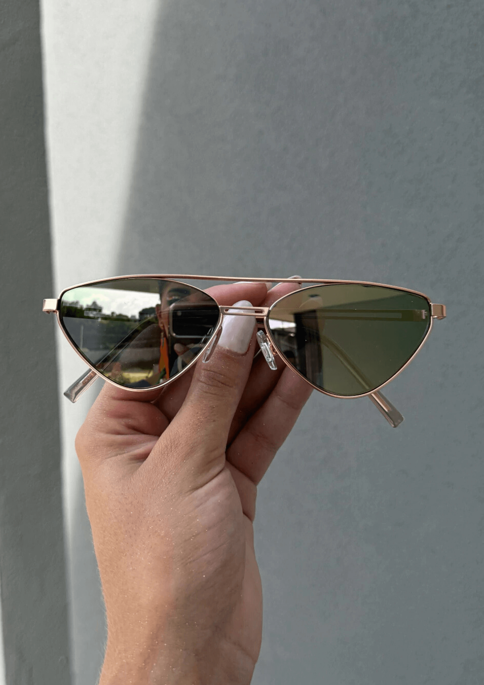 As lentes verde espelhadas contrastam harmoniosamente com as hastes em metal rosê, criando um visual moderno, marcante e ao mesmo tempo feminino. O efeito espelhado adiciona um ar contemporâneo e luminoso, perfeito para quem gosta de acessórios que se destacam sem perder a elegância.